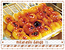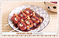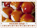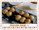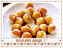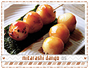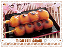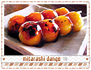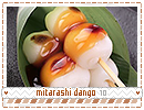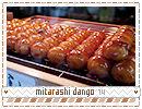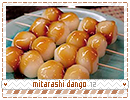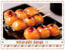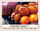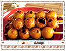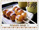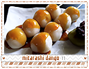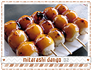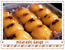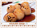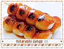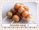 Mitarashi dango is a type of dango skewered onto sticks in groups of 3-5 (traditionally 5) and covered with a sweet soy sauce glaze. It is characterized by its glassy glaze and burnt fragrance. It originates from the Kamo Mitarashi Tea House in the Shimogamo area of Sakyo ward of Kyoto, Japan. Mitarashi dango is said to be named after the bubbles of the mitarashi (purifying water placed at the entrance of a shrine) of the Shimogamo shrine nearby. Another theory is that the 5-dango version sold at the original tea house was made to imitate a human body; the top-most dango represented the head, and the remaining four represented the arms and legs.