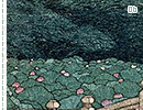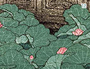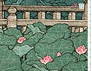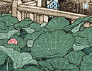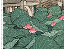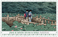 This print was created by Kawase Hasui in 1929. In the 1950s, the original woodblocks used to make this print were obtained by the publisher Shobisha. The image depicts the Shinobazu Pond in Ueno Park, Tokyo, home of the Benten temple. The pond is divided into three separate ponds, with the Lotus pond that is depicted here perhaps being the most remarkable. The print seems to show the pond in the height of summer, as it is at that time that the Lotus pond is fully covered by blossoming Lotus plants. In the middle are two women, seemingly enjoying the beautify of the sight as well. The original Benten Pond that belonged to Zōjō Temple does not exist anymore in its size. All that remains is a small pond at the southeast of Tokyo Tower in what is now Shiba Park.